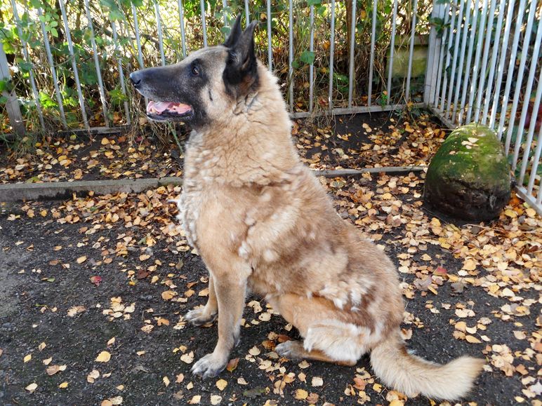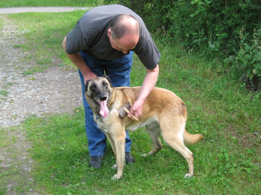| GROOMING Malinois need very little grooming normally. A quick going over with a slicker brush or a comb once a week is quite enough. However, twice a year they will moult, and if you have never seen it before, you will be amazed at the amount of hair that will come off your dog! You will literally be able to fill several carrier bags with fur. During the moult, you need a rake comb or slicker brush to get down to the bottom of the coat and remove the old undercoat which is soft. This process can take weeks, but it will greatly speed things up if you bath the dog when he or she starts to moult, and comb out as much loose hair as possible whilst the coat is still wet. An excellent grooming tool for a moulting Malinois is the “Furminator” comb. It’s expensive to buy so look out for it on Ebay where it is often sold much cheaper –it is well worth its price. Some working type Malinois have a smoother coat with less under coat, which makes them moult less. Others have very thick coats. Neutering a dog or spaying a bitch will make the coat grow thicker. |