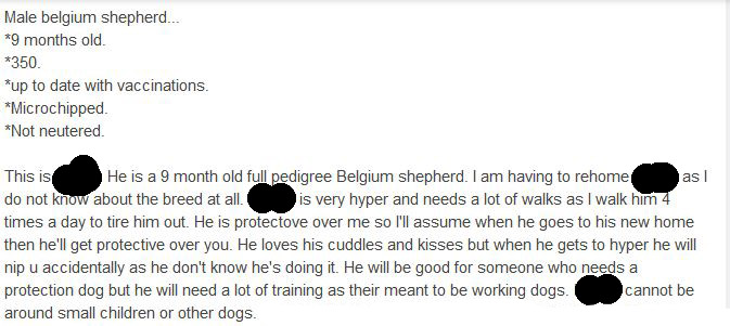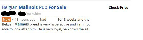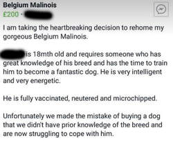 Visit the pages for the Belgian Shepherd rescues linked to below -and take a look at some of the adverts (also below) that shows how common it is for people to give up their Malinois due to "not coping". Many of these are puppies. Breed related rescues will be run by very experienced people. Sadly, general rescues/shelters often do not know enough about Belgian Shepherds, and rehome them to unsuitable homes, and sometimes they do not even know what breed it is they have in front of them. A notable rescue that is very responsible when it comes to rehoming Malinois and other energetic working type dogs is Battersea Dogs & Cats Home, as they will only rehome these dogs to carefully vetted special homes, sometimes to the police for instance, or to dog sports competitors. Indeed they now have a "Working Dog Manager" on their team responsible for this. If you have a Malinois you find yourself wanting to give up, please do contact first of all the dog's breeder, secondly breed rescue, and Battersea as a good alternative. Unless you are able to carefully vet the new homes yourself your dog may end up worse off. Never advertise any animal as "free to a good home" as anything could happen to it -there are people who are on the lookout for free dogs for dog fighting, for instance. www.battersea.org.uk/